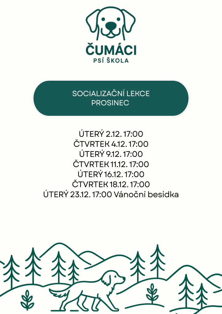 Rezervujte si svoje místo na prosincových socializačních lekcích. Čeká nás přivolání, chůze na vodítku, ale i výlet na trhy a pohyb v ruchu města. 23.12. se můžete těšit na vánočně laděnou lekci s dárky a kapkou svařáku jako loni. Těším se na Vás!