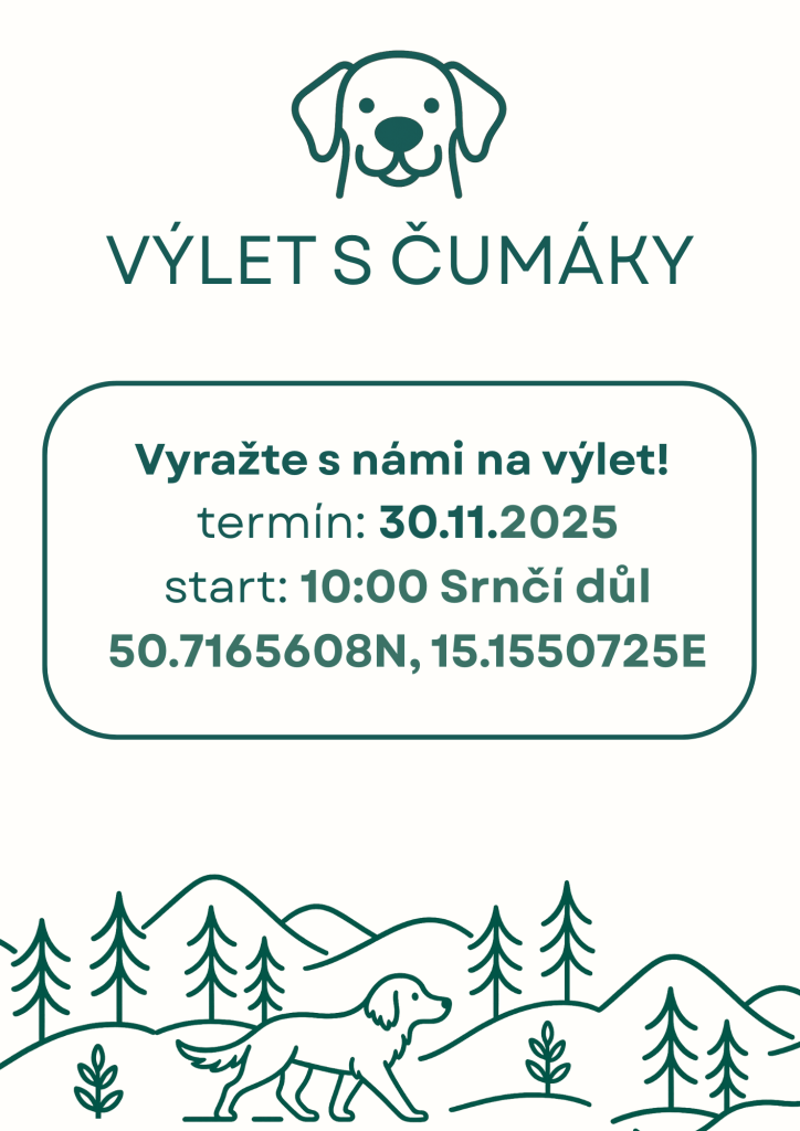 Srdečně Vás zvu na poslední listopadový výlet s Čumáky. Pozor! Trasa bude náročnější, než předchozí výlety. Půjdeme na rozhlednu Císařský kámen. Může nás potkat bahno, kaluže, kameny a různé další překážky. Sraz v 10:00 na horní louce v Srnčím dole. Parkování možné u Kauflandu Jateční.