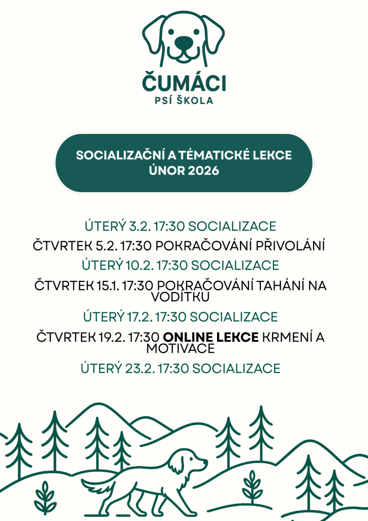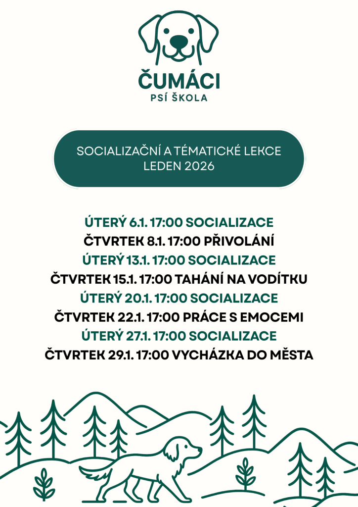 Rozpis lekcí na leden 2026. Čeká vás každoúterní socializace a tématické lekce s výzvou. Zarezervovat si můžete individuální lekci, nutriční konzultaci nebo venčení s Tlapkovodem.