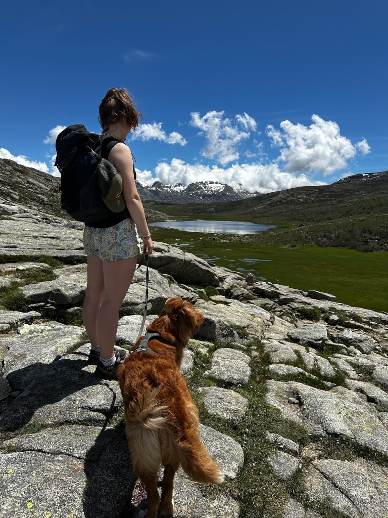Korsika nabízí nejen nádherné pláže ale i hory. Naše další cesta logicky vedla do hornatého srdce ostrova. V tuto chvíli se hodí zmínit poznatek, že Francouzi (Italové nevyjímaně) řídí jako naprostí psychopati. Na úzkých zvlněných silničkách se neobtěžují přibrzdit ani s kamionem. Jejich nerozum odneslo naše levé zrcátko, které dostalo zásah protijedoucí dodávkou. Na zužující se silnici lemující hluboký kaňon jsme nakonec byli možná rádi, že nám ho pán násilně sklopil a prasklý kryt jsme mu odpustili. Cílem cesty byl kemp Tuani. Pokud se sem chcete vydat, počítejte s nulovým signálem a sto procentním klidem. Kemp je přímo u řeky s výhledem na okolní vrcholy v květnu stále ještě pokryté sněhem. Na ráno doporučujeme objednání čerstvého pečiva. Vyzkoušeli jsme bagety, croissanty i pain au chocolat. Lepší start dne si jen těžko představit. Výšlap na blízký kopec, který končí v ničem nám chuť každopádně trochu zkazil. Po cestě jsme narazili na pár dní mrtvou krávu. Valdu naštěstí kadáver nezajímal, ale malý vědátor ve mně se probudil a nedalo mi nejít z dostatečné vzdálenosti prozkoumat, co se přihodilo.