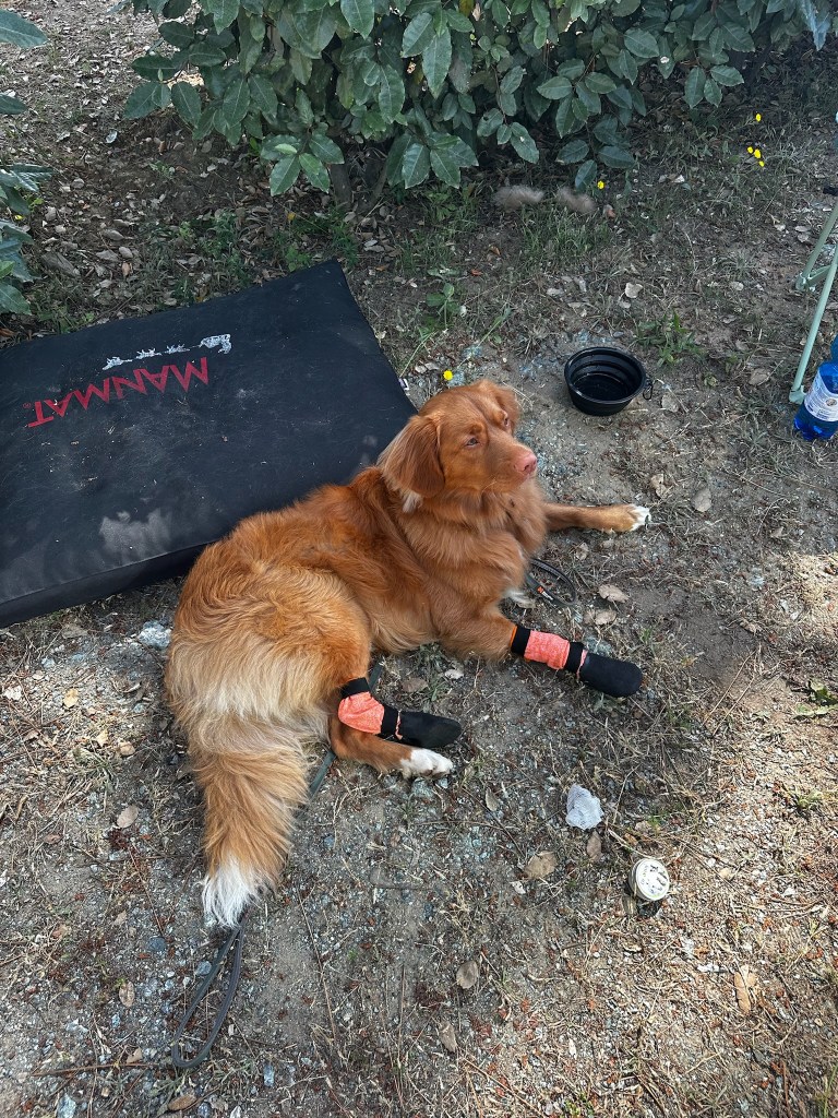 Po cestě jsme zastavili na pauzu a rychlé venčení. Valda vyskočil z auta a najednou pajdá na přední packu. To by nám tak ještě scházelo, aby měl nějaký defekt i on. Co čert nechtěl, obě pravý packy pořezaný. Vytahujeme psí lékárničku a jdeme psa odoperovat. V tu samou chvíli se na nás sletěl roj čítající vyšší stovky komárů.