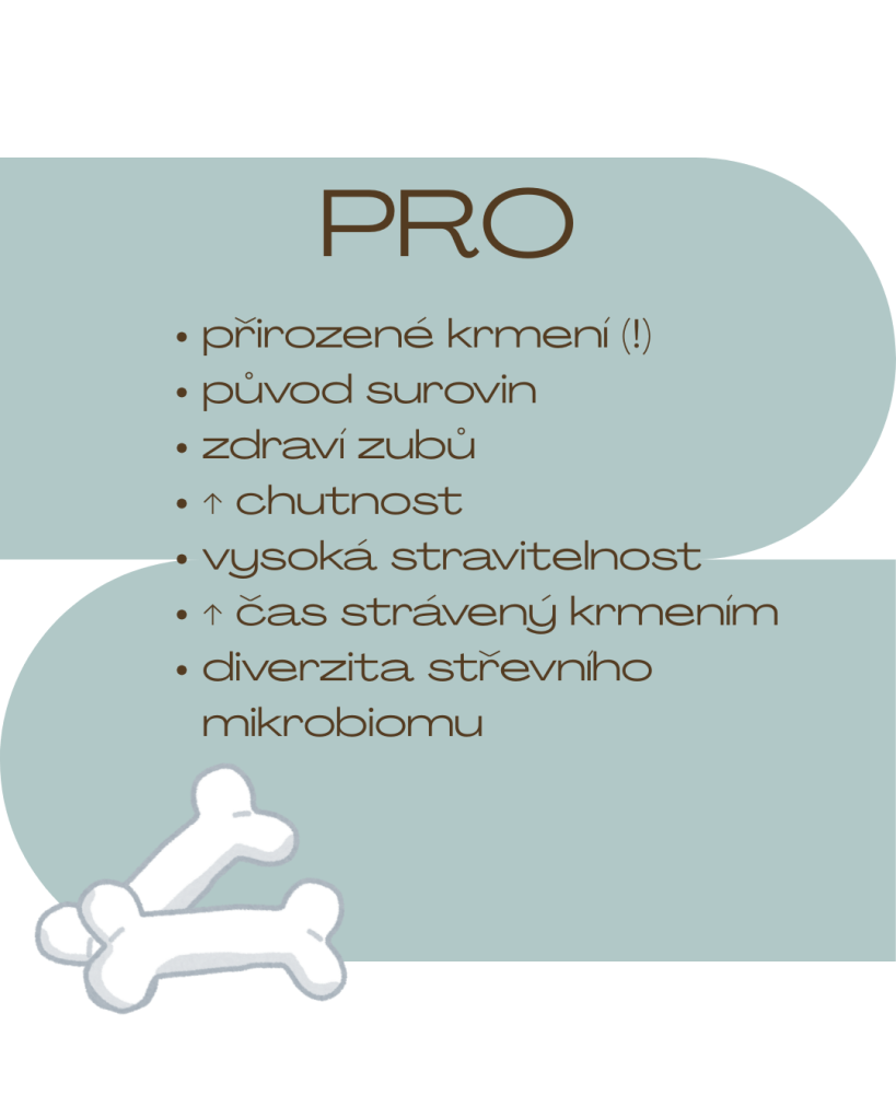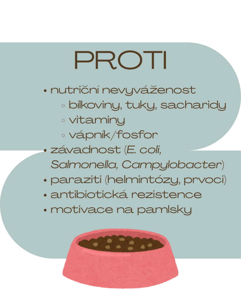 Vše nemůže být tak jednoduché, proto má barf i několik vad na kráse. Největším strašákem (hlavně pro mě samotnou) je možnost, že se kost zasekne někde po cestě do žaludku a nebo na cestě ze psa ven. Na téma kostí se hodí říct, že se jedná o syrovou potravu, takže kosti nikdy nepodávat vařené. Mají pak tendenci se tříštit a to se pak zapichuje jedna báseň. Čeho bychom se měli obávat ovšem více je nutriční vyváženost, respektive nevyváženost. Bavíme se zejména o poměrech základních minerálů vápníku a fosforu, dále pak o vitamínech ale třeba i poměrech makroživin (bílkoviny, tuky, sacharidy). U makroživin bychom se měli držet právě poměru 70/30. 70% živočišné složky jako je svalovina, kosti, chrupavky, šlachy a vnitřnosti doplněné o 30% rostlinné složky (zelenina, ovoce). Dlouhodobé podávání nevyvážené diety může mít za následek zdravotní obtíže. V tomto směru trpí nejvíce pohybový aparát. Nelze opomenout ani nezávadnost. Je zapotřebí dodržovat relativně přísná hygienická opatření, abychom předešli kontaminaci a zamezili případnému množení nežádoucích patogenů. Krmení barfem s sebou nese významné riziko nákazy salmonellou, E. coli a dalšími. Základem je poctivé mražení. Maso by mělo v mrazáku při teplotě minimálně -18°C strávit alespoň týden. Pozor ale! Co jednou rozmrazíte znovu do mrazáku nepatří. Fáze rozmrazování je taktéž klíčová. Maso nechte povolit ideálně v lednici. Někdy se vyplatí maso připravené ke krmení zalít vroucí vodou, tak trochu pro jistotu. V neposlední řadě tu máme chutnost barfu a motivaci na žrádlo v tréninku. Vzhledem k významné chutnosti masa je pes často špatně motivován v tréninku třeba na obyčejné granule nebo i na pamlsky. Vyplatí se potom cvičit na maso a tím pádem i zainvestovat do gumových rukavic a kvalitního pamlskovníku.